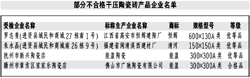 本報訊記者龔漢斌報道:近日,江西省質監(jiān)局公布了近期對干壓陶瓷磚產(chǎn)品進行省級產(chǎn)品質量監(jiān)督抽查的結果。質監(jiān)部門共抽查了51家生產(chǎn)企業(yè)生產(chǎn)的52批次產(chǎn)品,抽樣合格率90.4%。抽查結果表明,本次抽查的陶瓷磚其放射性核素限量指標均達到了標準規(guī)定的要求;但仍有部分產(chǎn)品存在一些問題。