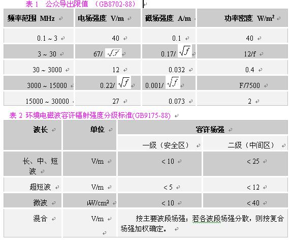 在對一般環(huán)境的電磁輻射分析中,應(yīng)主要選用《環(huán)境電磁波衛(wèi)生標(biāo)準(zhǔn)》主要選用《環(huán)境電磁波衛(wèi)生標(biāo)準(zhǔn)》(GB9175-88),根據(jù)輻射源的主要輻射頻率,參照表2,找到其輻射強度限值。注意掌握三個標(biāo)準(zhǔn)限值,一般我們把居民居住的環(huán)境按一級安全區(qū)處理,則其標(biāo)準(zhǔn)限值為:在長、中、短波,電場強度應(yīng)小于10V/m;在超短波段,電場強度應(yīng)小于5V/m;在微波波段,其輻射功率密度應(yīng)小于10μW/cm2?紤]到對在電磁輻射環(huán)境內(nèi)工作人員的保護(hù),我們建議在職業(yè)安全衛(wèi)生領(lǐng)域,采用《電磁輻射防護(hù)規(guī)定》(GB8702-88)的相應(yīng)限值。